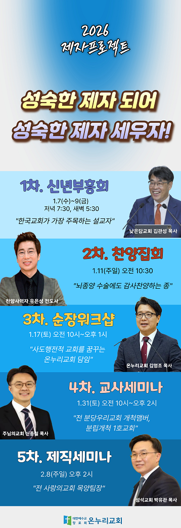 공지 2026년 1-2월 교회 행사 안내 김진 2025-12-26 추천 0 댓글 0 조회 226 http://cconnuri.onmam.com/bbs/bbsView/29/6591903 첨부파일 (0) 0