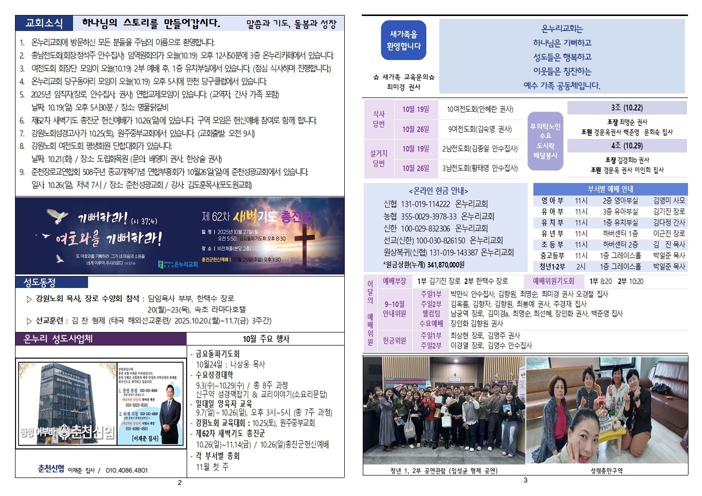 | 다음글 | 2025년 10월 12일 주일 주보 | 김진 | 2025.10.11 | 0 | 201 |