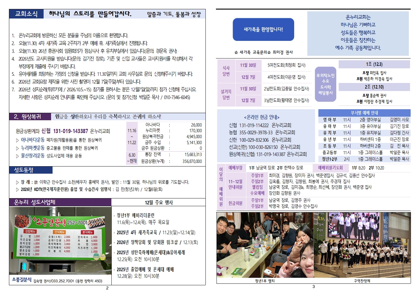 2025년 11월 30일 주일 주보 김진 2025-11-29 추천 0 댓글 0 조회 89 http://cconnuri.onmam.com/bbs/bbsView/39/6583603 첨부파일 (0) 0