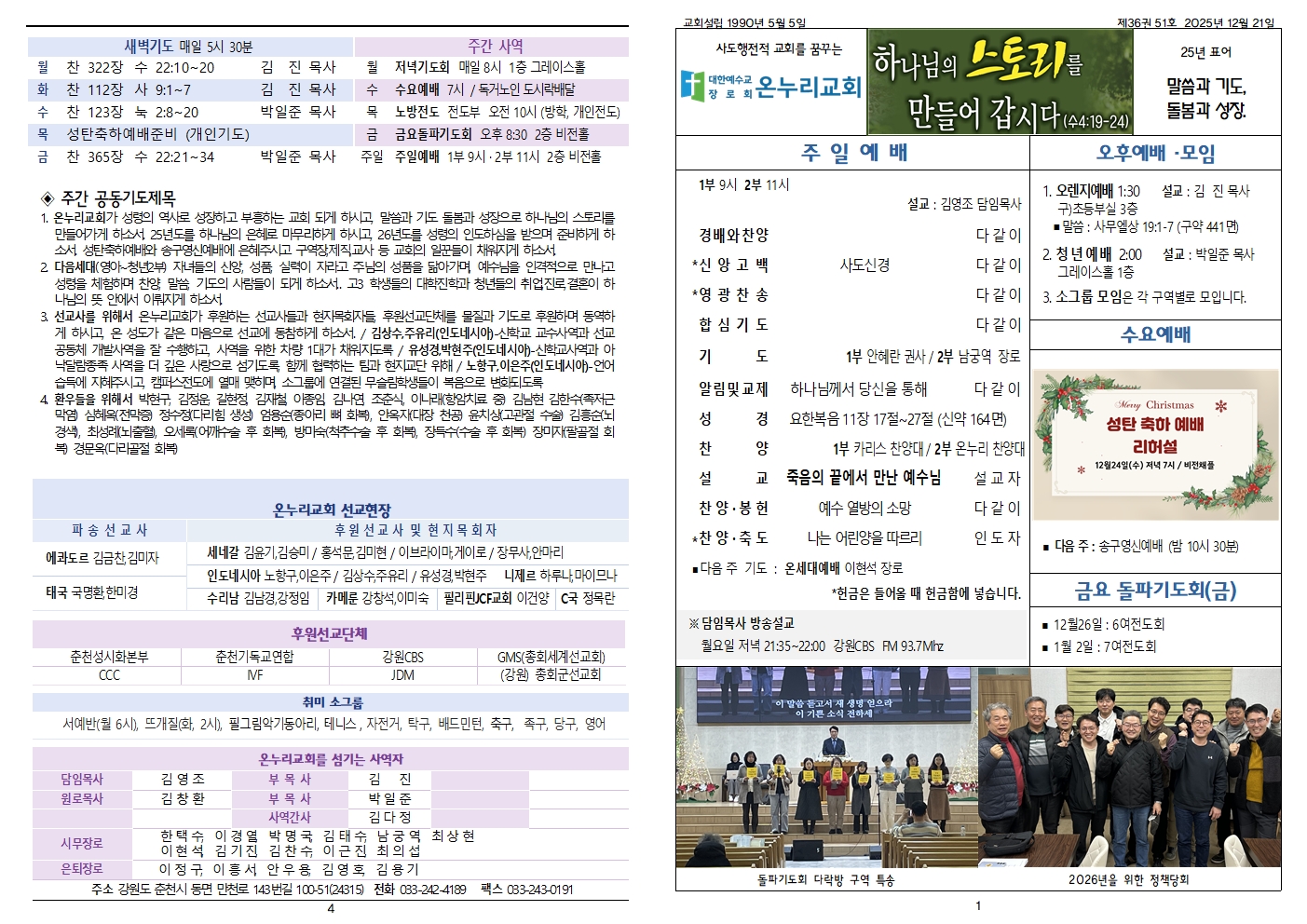| 이전글 | 2025년 12월 25일(목) 성탄축하예배 순서지 | 김진 | 2025.12.24 | 0 | 103 |
