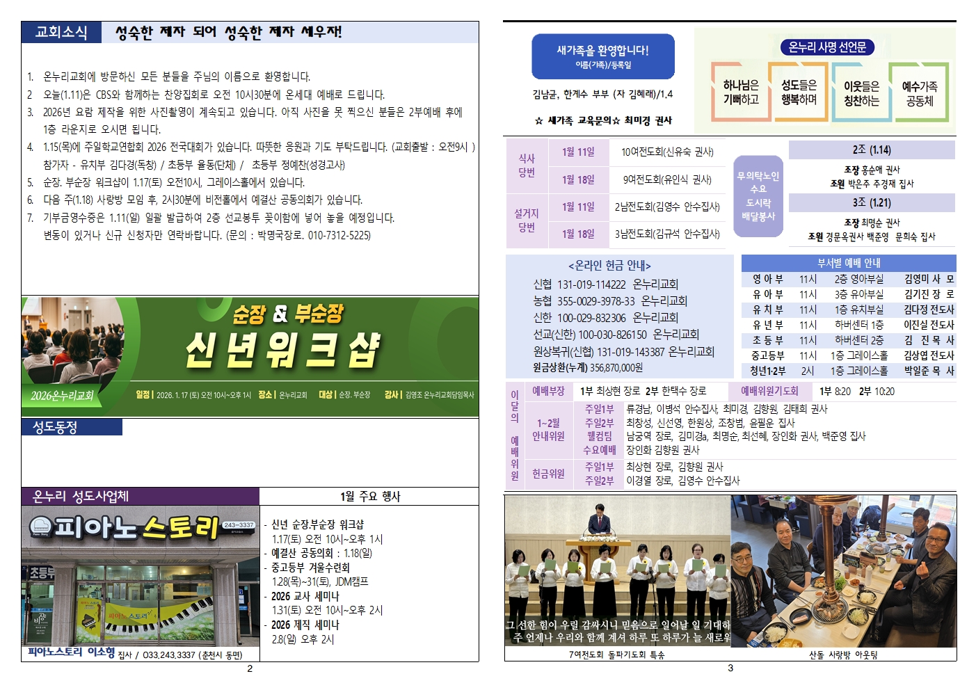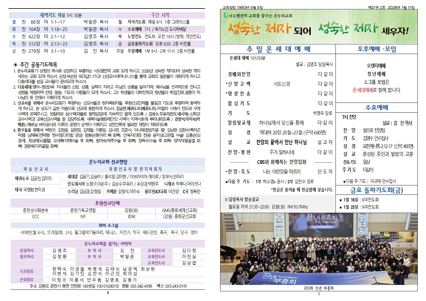| 다음글 | 2026년 1월 4일 주일 주보 | 김진 | 2026.01.03 | 0 | 202 |